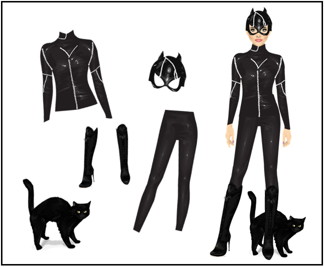 Essa fantasia eu quis fazer uma Mulher-Gata mais moderninha, na verdade é uma opção para quem não tem a roupa/ fantasia dela no Stardoll e quer se vestir dessa personagem, basta você usar e abusar do couro, dê preferência à roupas curtas e justas e coloque umas orelhinhas e você estará pronta.